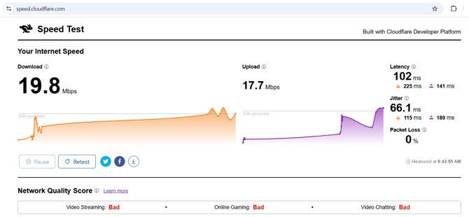 Visit speed.cloudflare.com in any browser, click "start," and observe the results. An optimal speed is 25 Mbps with no packet loss.